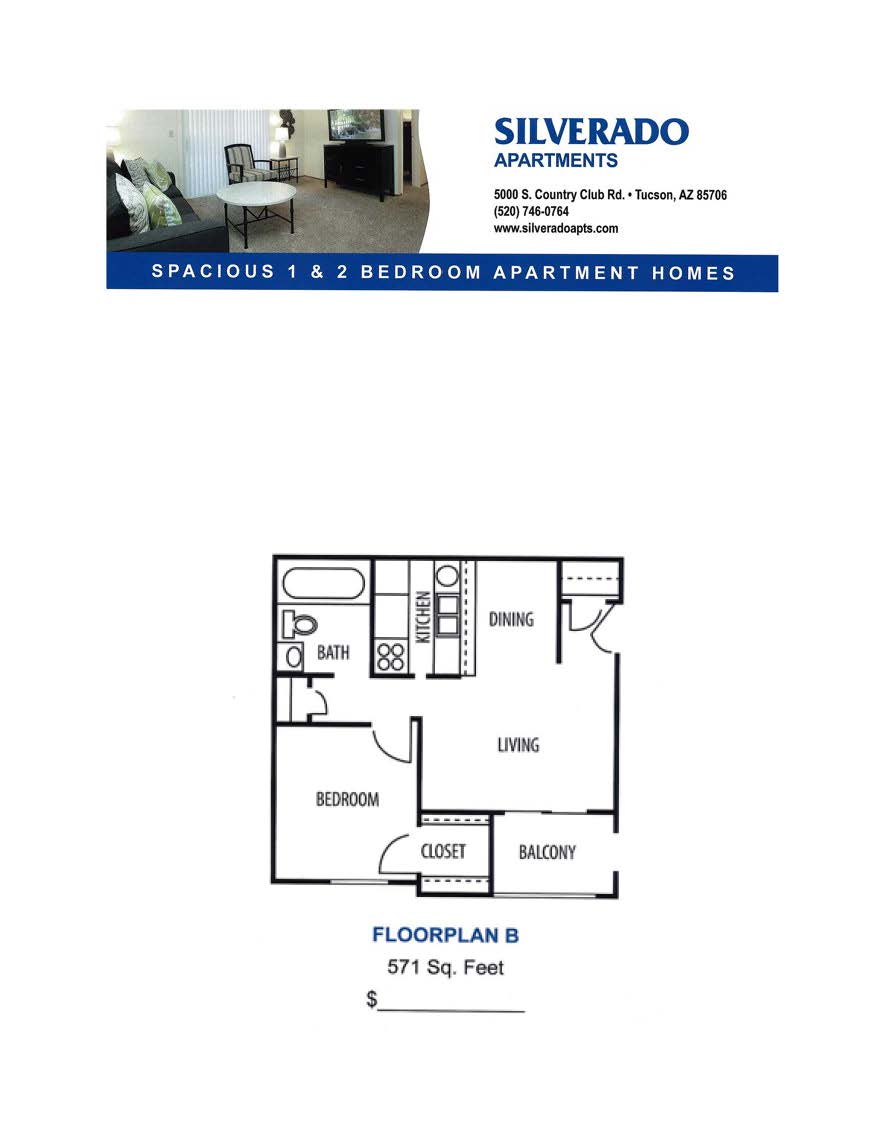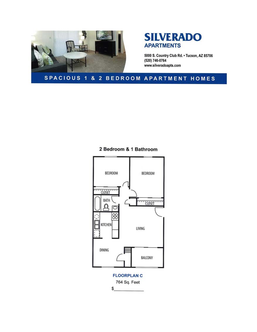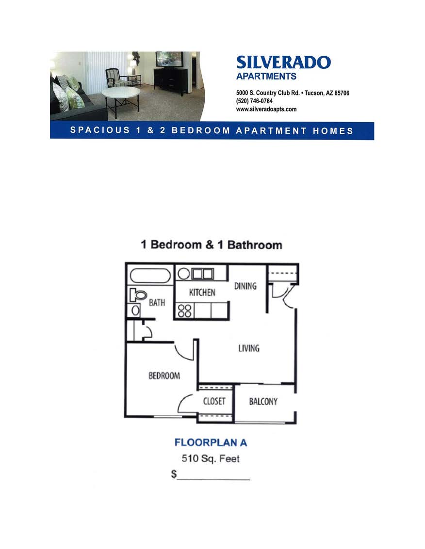 Silverado Apartments are located in Tucson, Arizona and offer one and two bedroom apartment homes! The apartment amenities include central air conditioning, cable and internet ready, ceiling fans, modern kitchens with all electric appliances including a dishwasher. Spacious bedrooms with walk-in closets in some floor plans. Our community amenities include a newly renovated clubhouse with large upgraded kitchen area that features granite countertops perfect for celebrating that special occasion. Our fitness center is conveniently located next to our clubhouse and for our residents exclusive use. Our laundry facility is centrally located for your convenience. Our lush landscaping includes manicured lawns with large, mature trees throughout the property. Enjoy our refreshing pool and spa along with a playground. Be close to everything you need: shopping, dining, banking, easy access to I-10, close to TEP Ball Park, hospitals and much more. Silverado is conveniently located near I-10, businesses, Davis Monthan Air Force Base, US Border Patrols Tucson headquarters, Tucson International Airport and much more! Silverado has many community and apartment amenities for you!